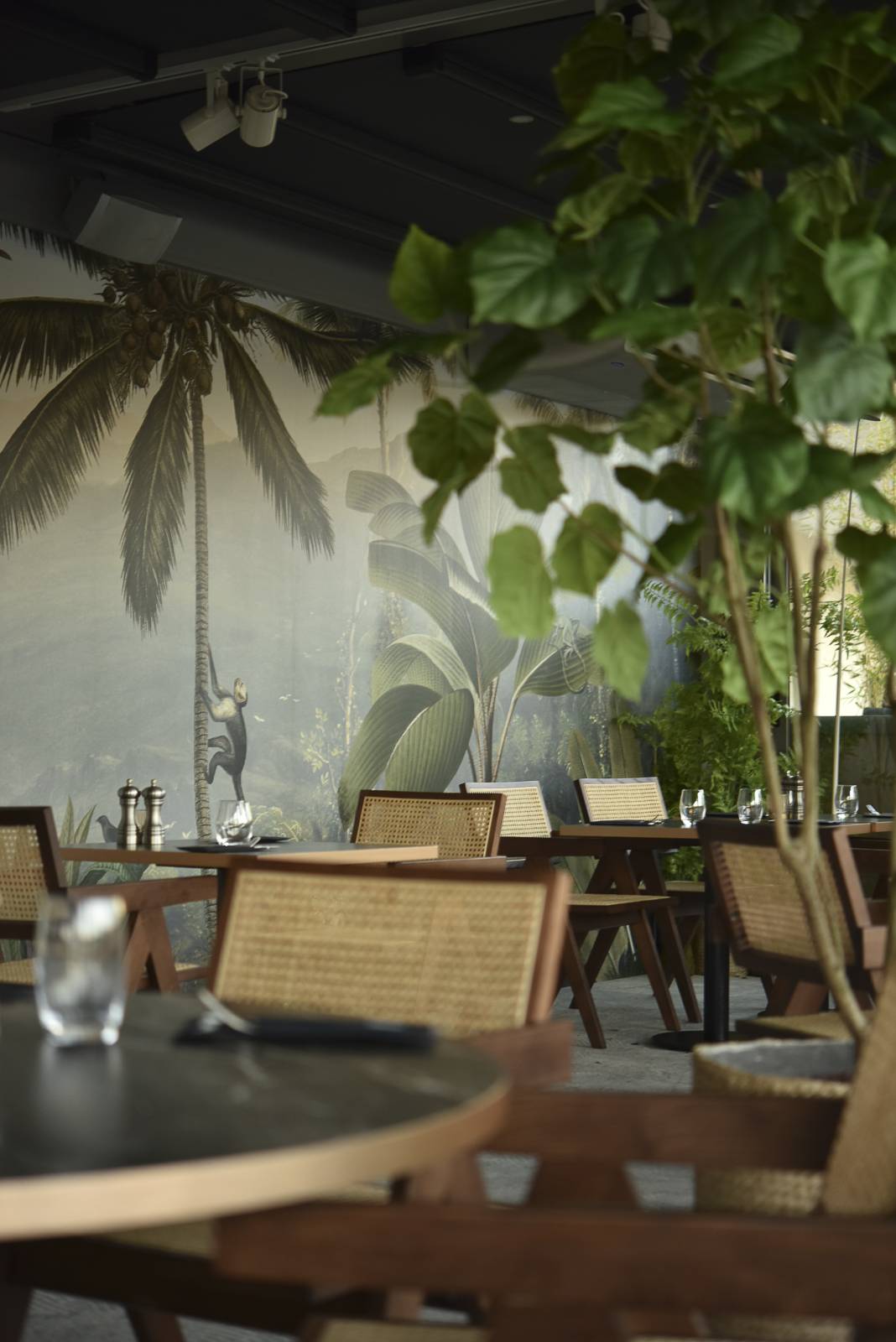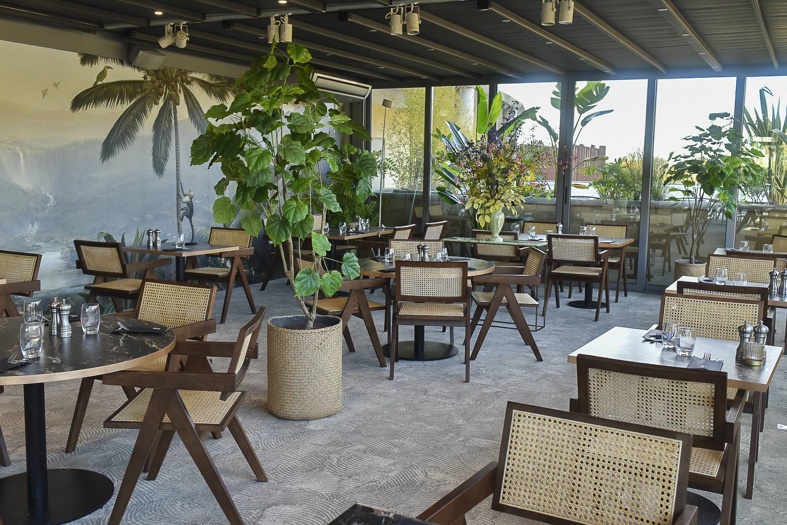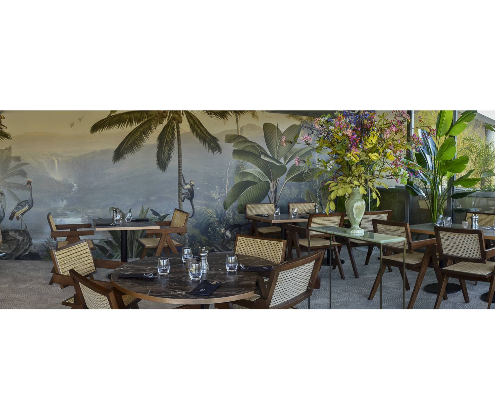 Le restaurant se distingue par son véranda ouverte sur la nature, offrant une transition harmonieuse entre intérieur et extérieur. Le décor a été soigneusement conçu par les experts de Jungle Art, créant ainsi une véritable oasis de verdure où chaque détail évoque la sérénité et le calme. Cette atmosphère végétale et apaisante fait de notre espace un lieu idéal pour se détendre tout en savourant une cuisine raffinée.