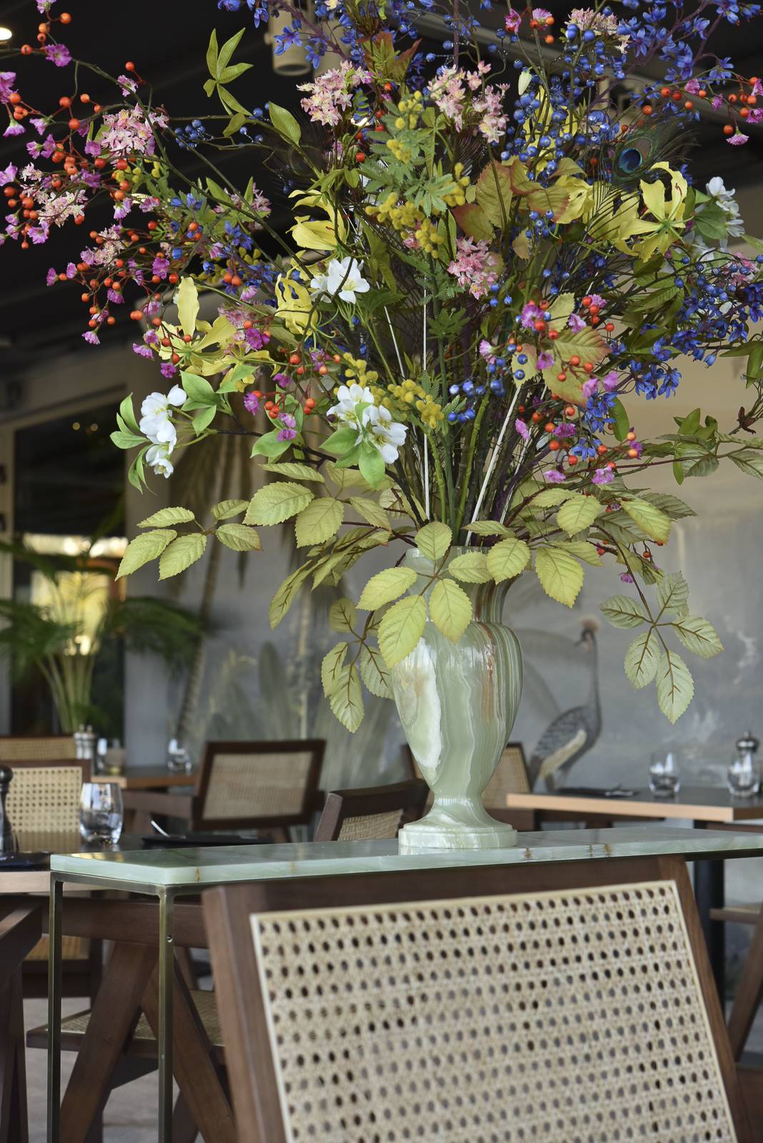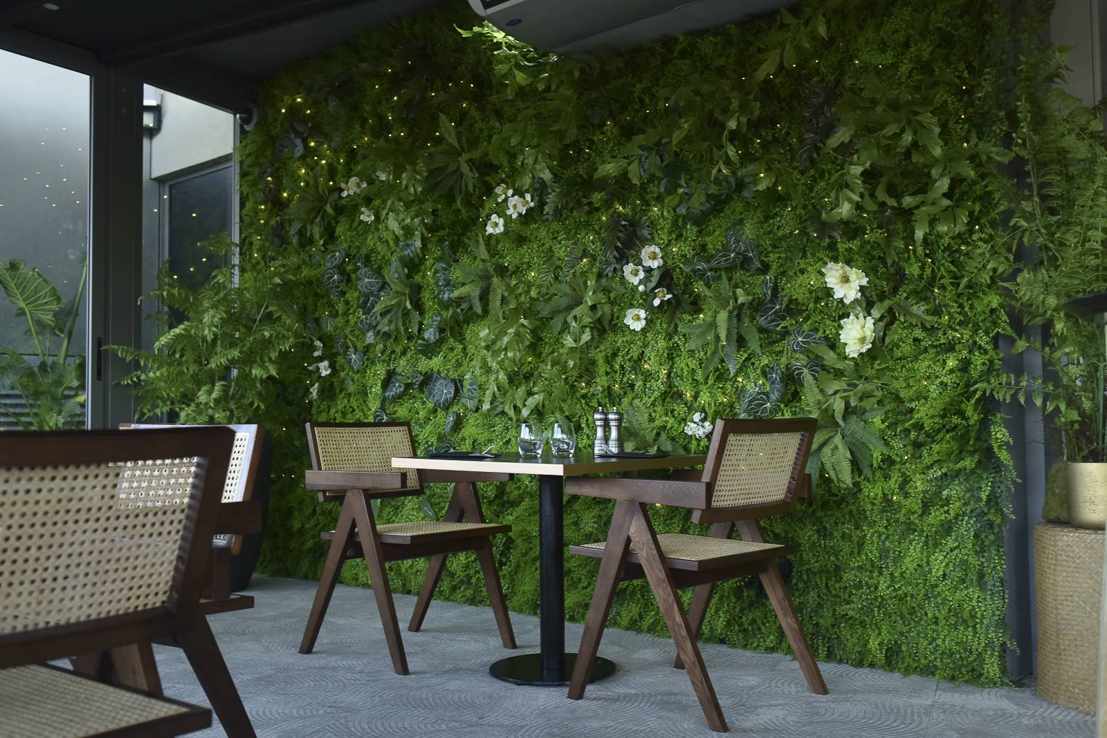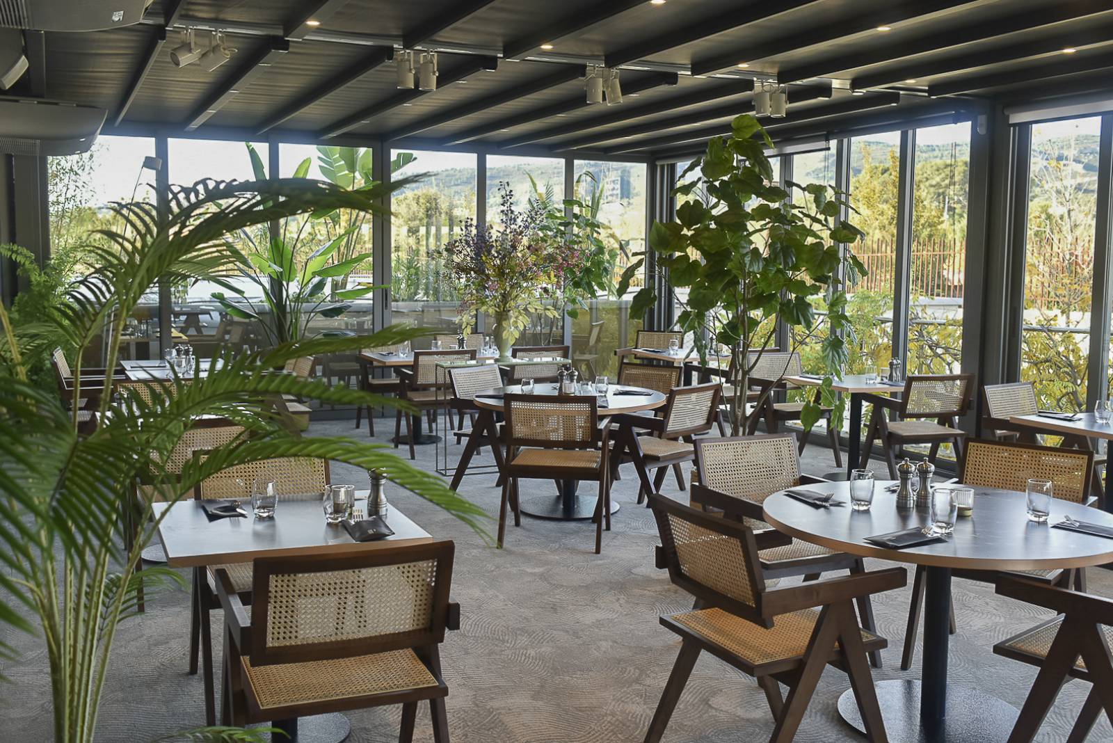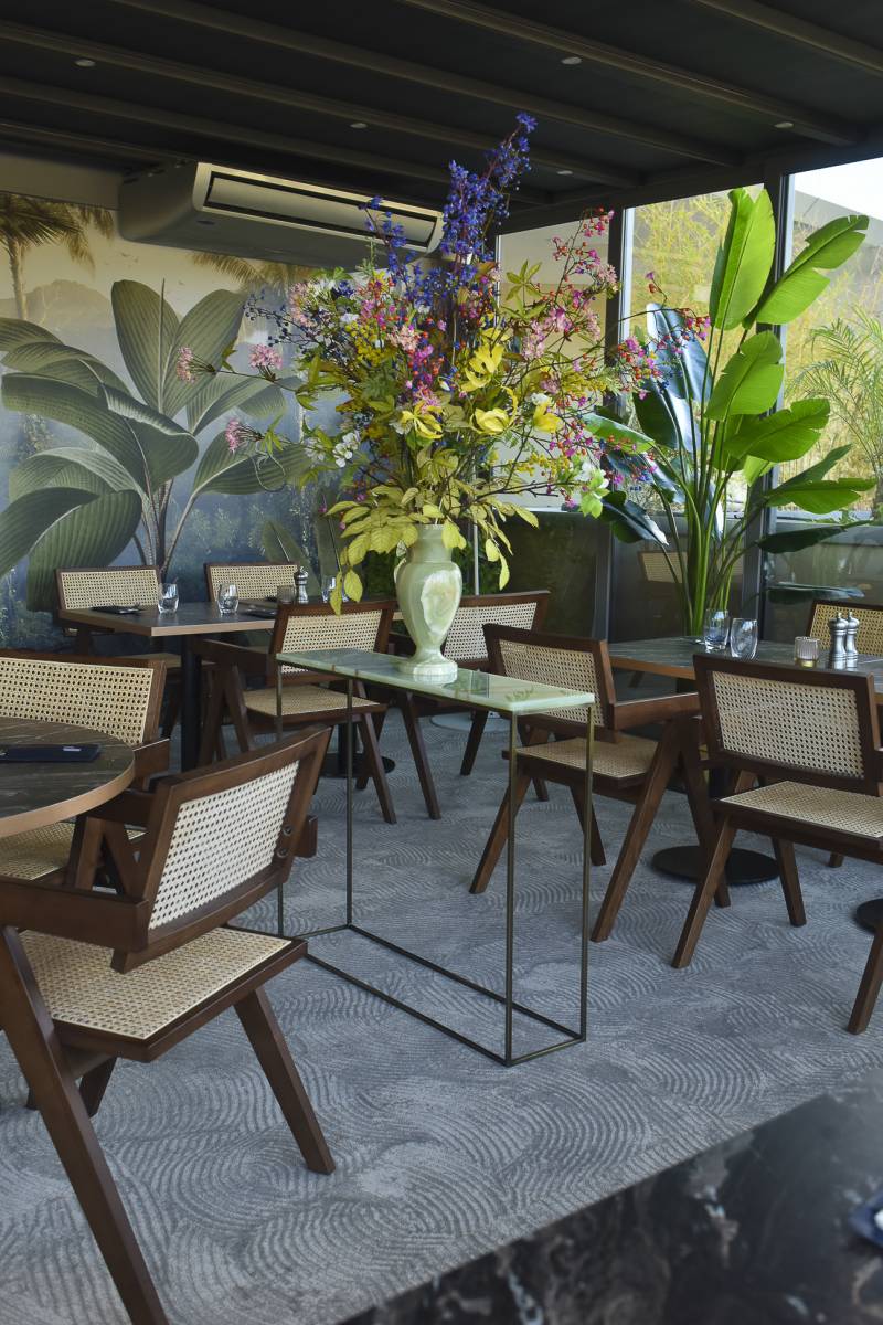 Le restaurant se distingue par son véranda ouverte sur la nature, offrant une transition harmonieuse entre intérieur et extérieur. Le décor a été soigneusement conçu par les experts de Jungle Art, créant ainsi une véritable oasis de verdure où chaque détail évoque la sérénité et le calme. Cette atmosphère végétale et apaisante fait de notre espace un lieu idéal pour se détendre tout en savourant une cuisine raffinée.