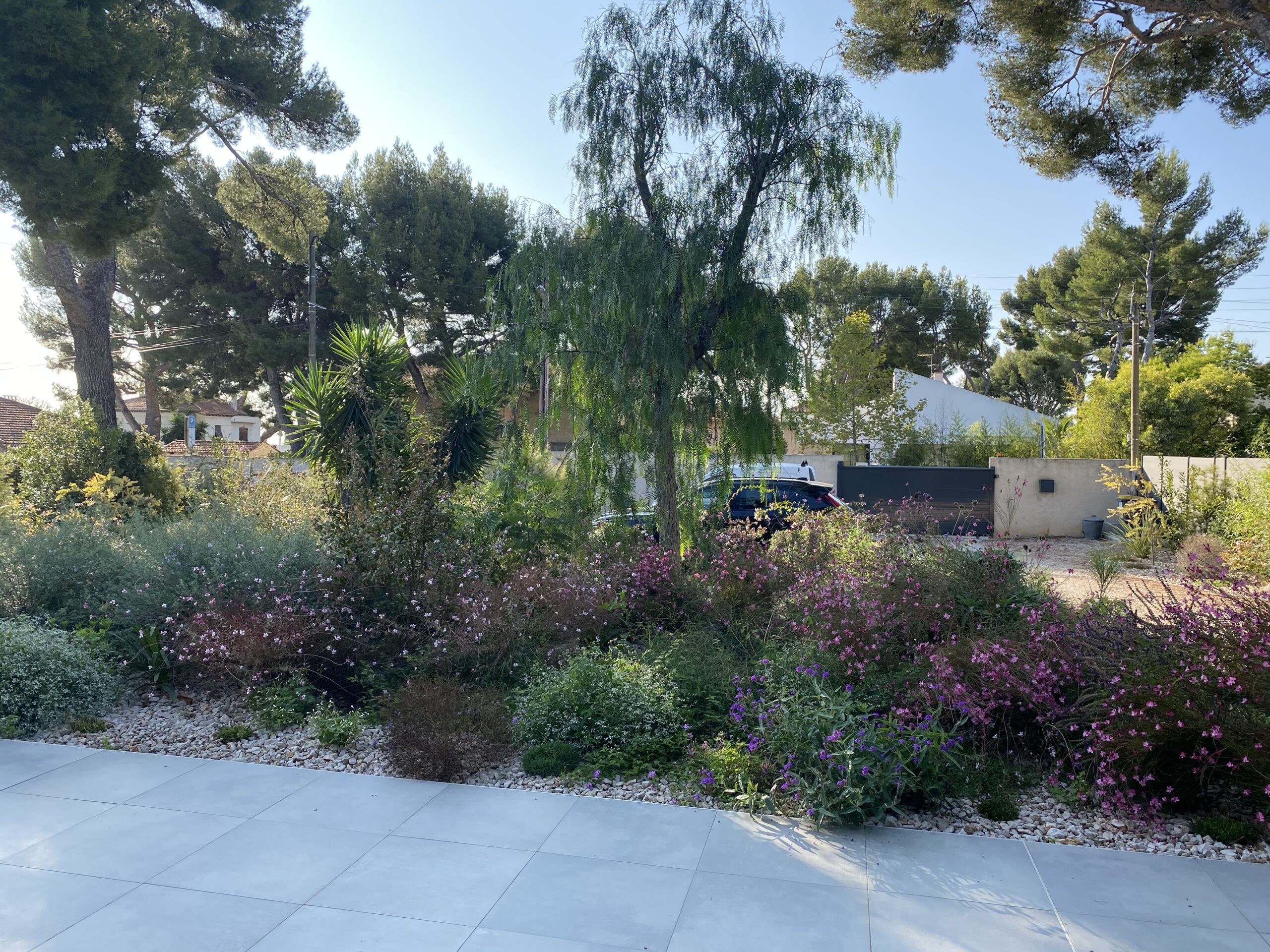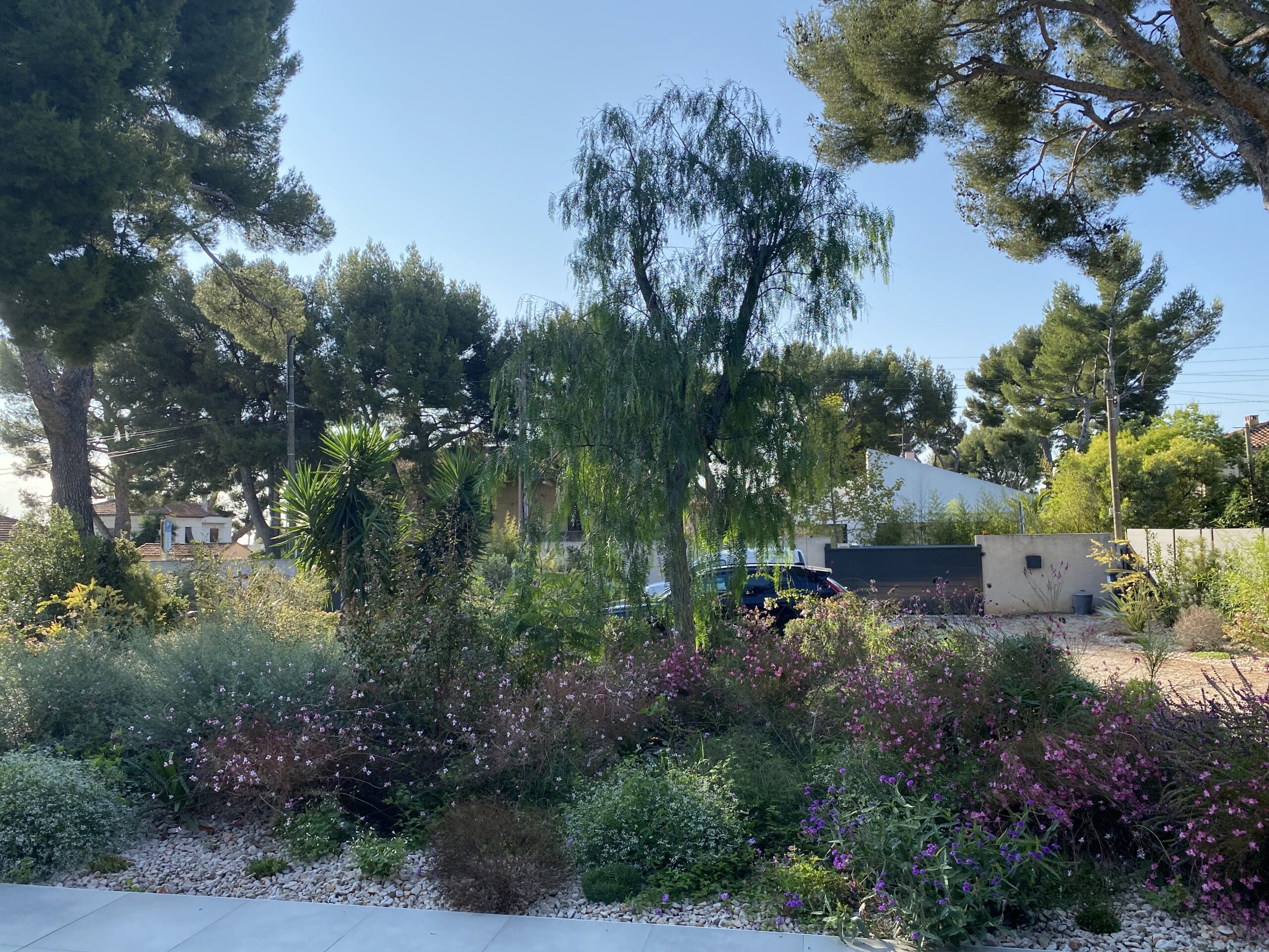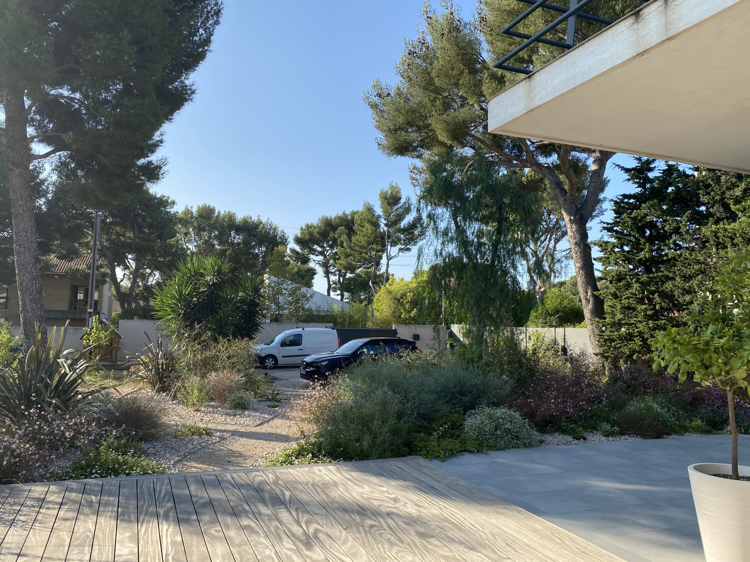 À La Ciotat, Le Jardin de Parme est né d’un terrain vierge et d’une vision : créer un espace où chaque saison dévoile une palette de nuances bleues. Conçu pour s’adapter aux envies de ses habitants, ce jardin allie le sauvage et le sophistiqué, reflétant l’approche unique de Jungle Art en matière de design paysager. l’enjeu était de taille cacher les voiture de la vue du salon et faire en sorte que l’espace appartienne aux enfants sans que le graphisme s’en ressente .