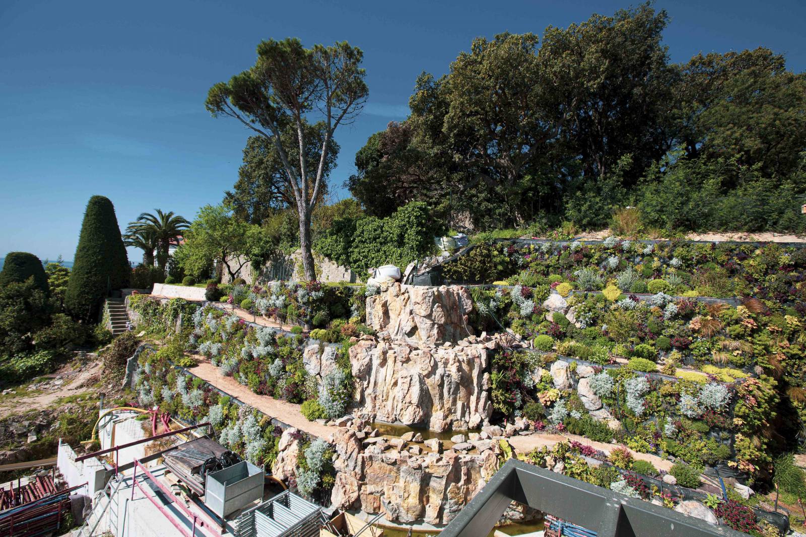 La cascade coule de bassin en bassin jusqu’à la piscine. L’aménagement du chemin dans le jardin vertical a été réalisé pour profiter de la vue imprenable sur la baie de Cannes. Ce projet a été fou ! mais tellement enrichissant !