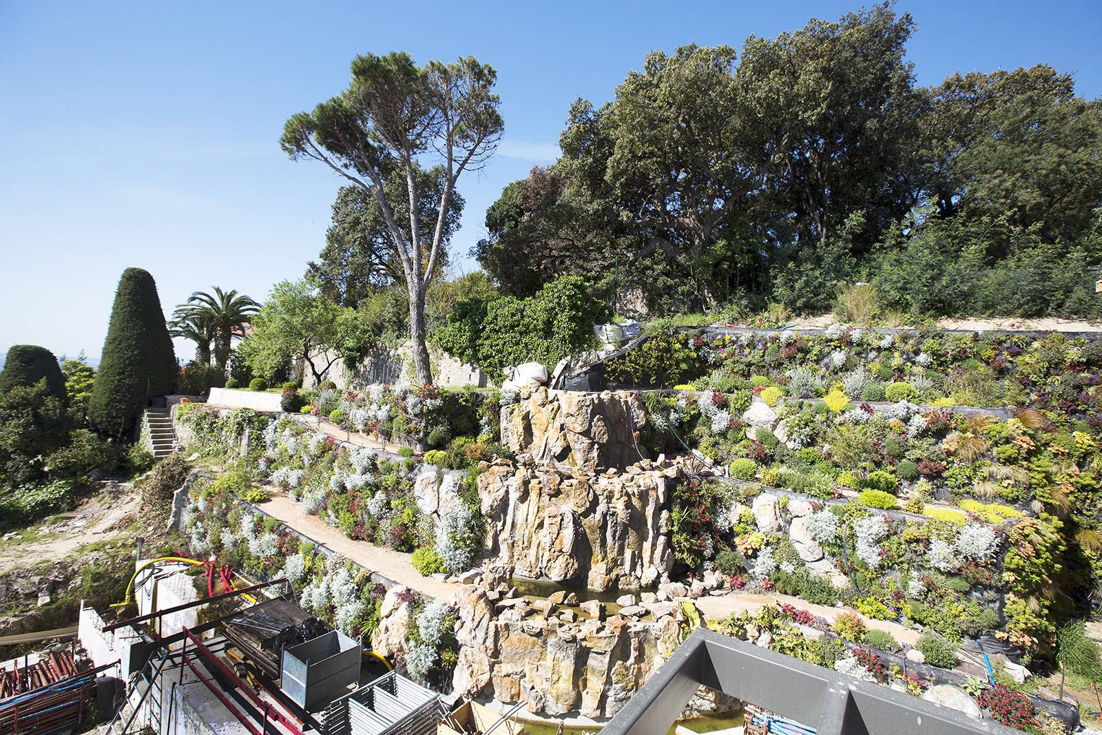 Le projet n’en a pas été moins fou … Un mur végétal à la verticale de 8 mètres de haut où serpente chemin de promenade sur trois restanques, agrémentées par une cascade de faux rochers, plus vrais que nature ? Oui ce projet, Jungle Art l’a réalisé.