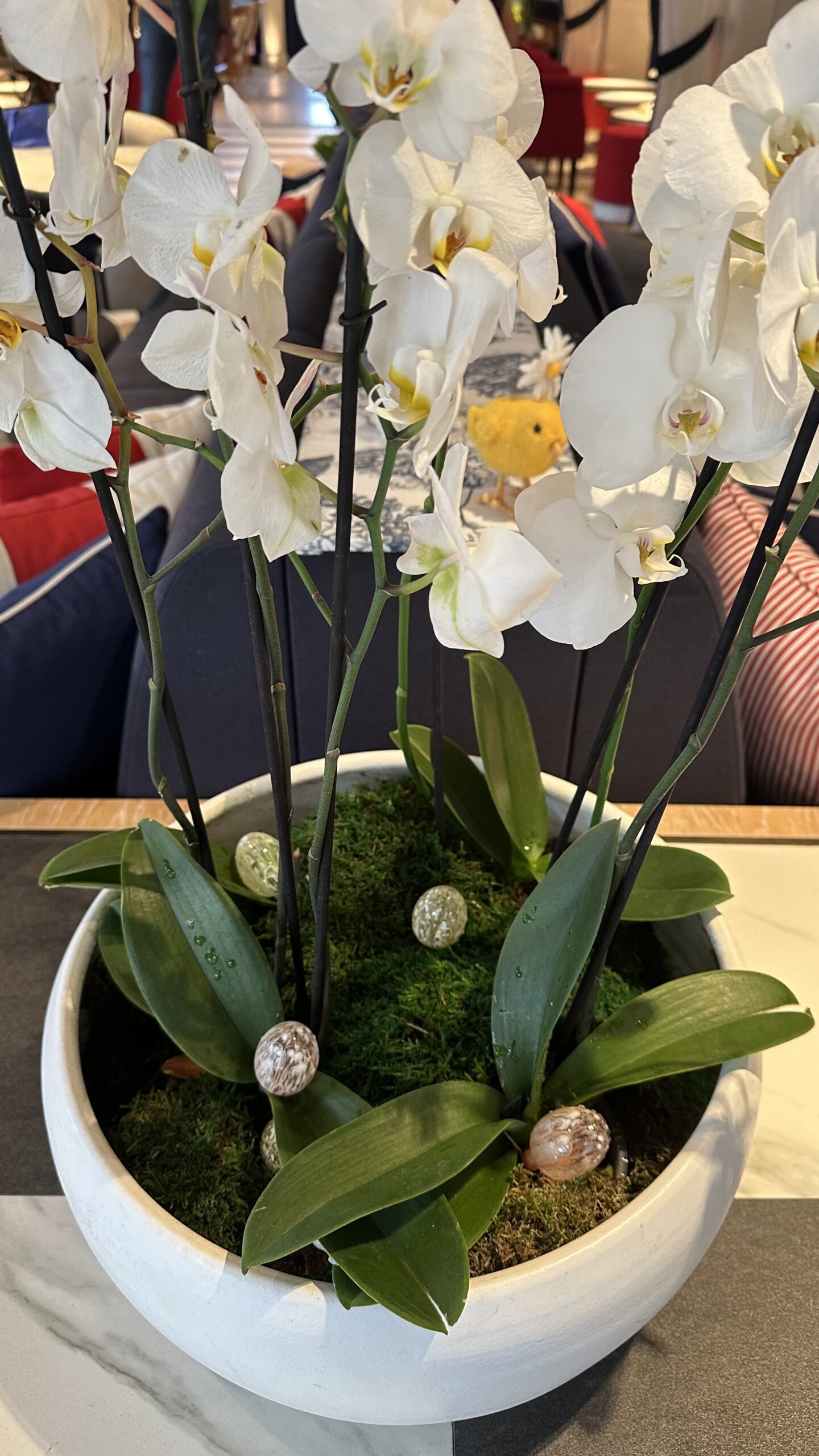 Décoration de Pâques raffinée et poétique à l’hôtel 5 étoiles Arev Saint-Tropez Pour célébrer Pâques, j’ai eu l’honneur de réinventer la décoration de l’hôtel Arev à Saint-Tropez, un établissement 5 étoiles où l’élégance et la créativité se rencontrent. Mon approche a consisté à mêler tradition pascale et innovation artistique, afin de plonger les hôtes dans une atmosphère printanière à la fois féérique et raffinée. Un majestueux arbre de Pâques, habillé d’œufs délicatement décorés et de fleurs printanières, s’est imposé comme le cœur de la mise en scène, en écho au sapin de Noël, mais dans une version lumineuse et colorée, porteuse de renouveau. Les nids de Pâques remplacent les boules traditionnelles, parsemés de plumes, de coquilles dorées et de chocolats raffinés, créant une poésie visuelle inattendue. Les tables ont été transformées en véritables chemins de chasse aux œufs : tapis de mousses naturelles, éclats de fleurs fraîches et petites figurines cachées composaient une scénographie ludique et élégante. Chaque détail invitait à l’émerveillement, rappelant les joies de l’enfance tout en s’inscrivant dans une esthétique sophistiquée. Dans les espaces communs, des compositions florales aériennes et des suspensions d’œufs en verre apportaient une touche de modernité et de légèreté. Quant aux chambres, elles accueillaient les hôtes dans une ambiance intime et poétique, grâce à des décors miniatures évoquant une chasse aux œufs enchantée, entre nature et rêve. Cette réalisation exprime l’équilibre parfait entre respect des traditions pascales et innovation décorative, offrant aux clients de l’hôtel Arev une expérience sensorielle et mémorable, où Pâques devient un art de vivre.