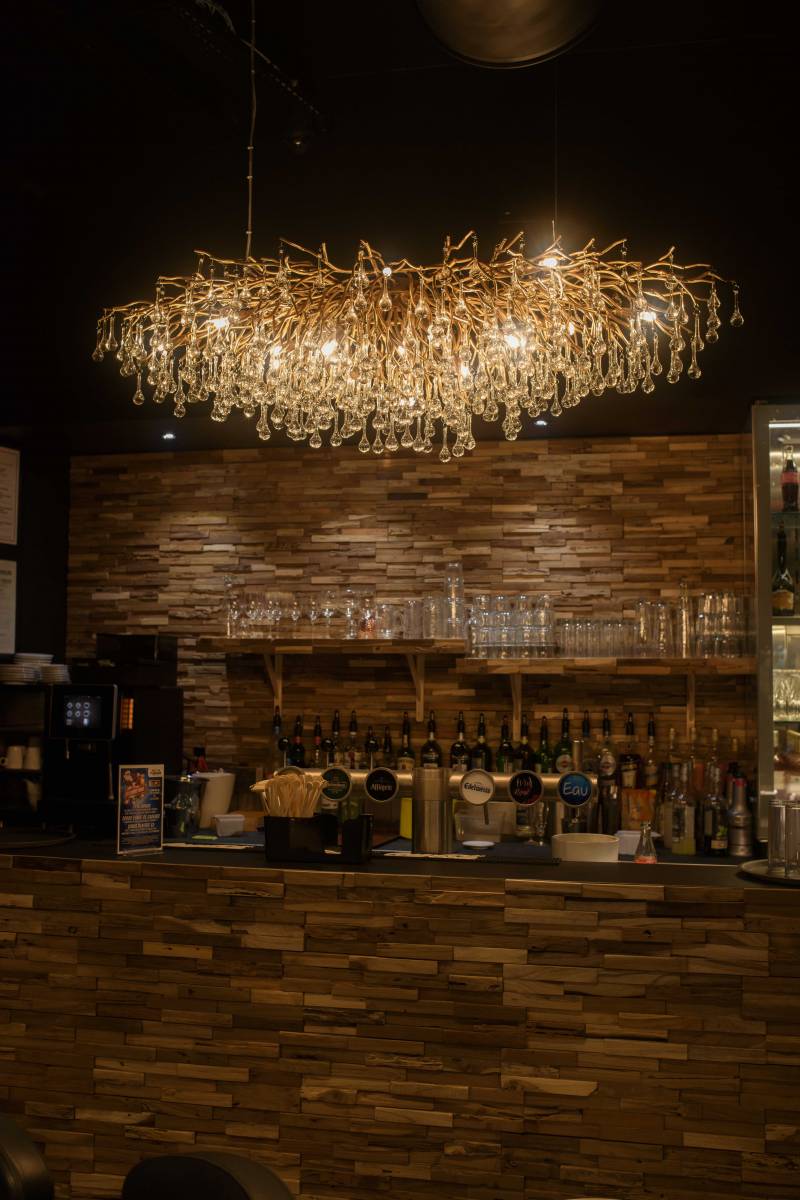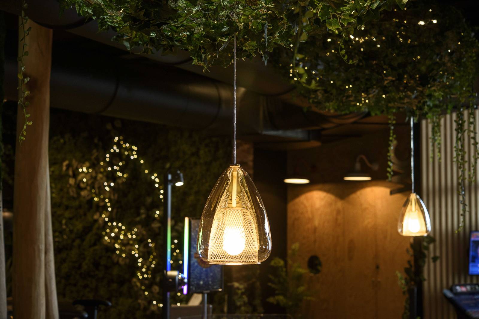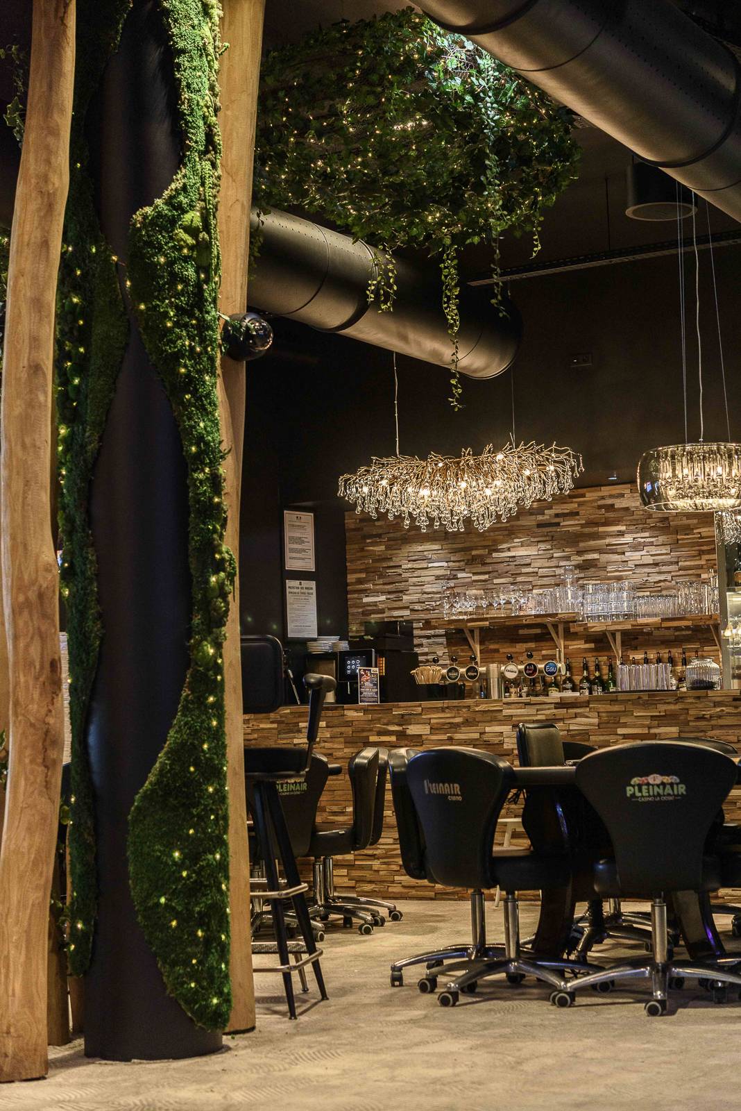 Les piliers de la salle sont habillés de troncs d’arbres, symbolisant la force et la magie de la nature. Cette décoration végétale crée un cadre visuel puissant, immergeant les joueurs dans un univers féerique. Au-dessus, un plafond végétal suspendu, composé de feuillages et de lucioles, enveloppe la salle dans une atmosphère apaisante, adoucissant l’espace avec une sensation de profondeur et de mystère.