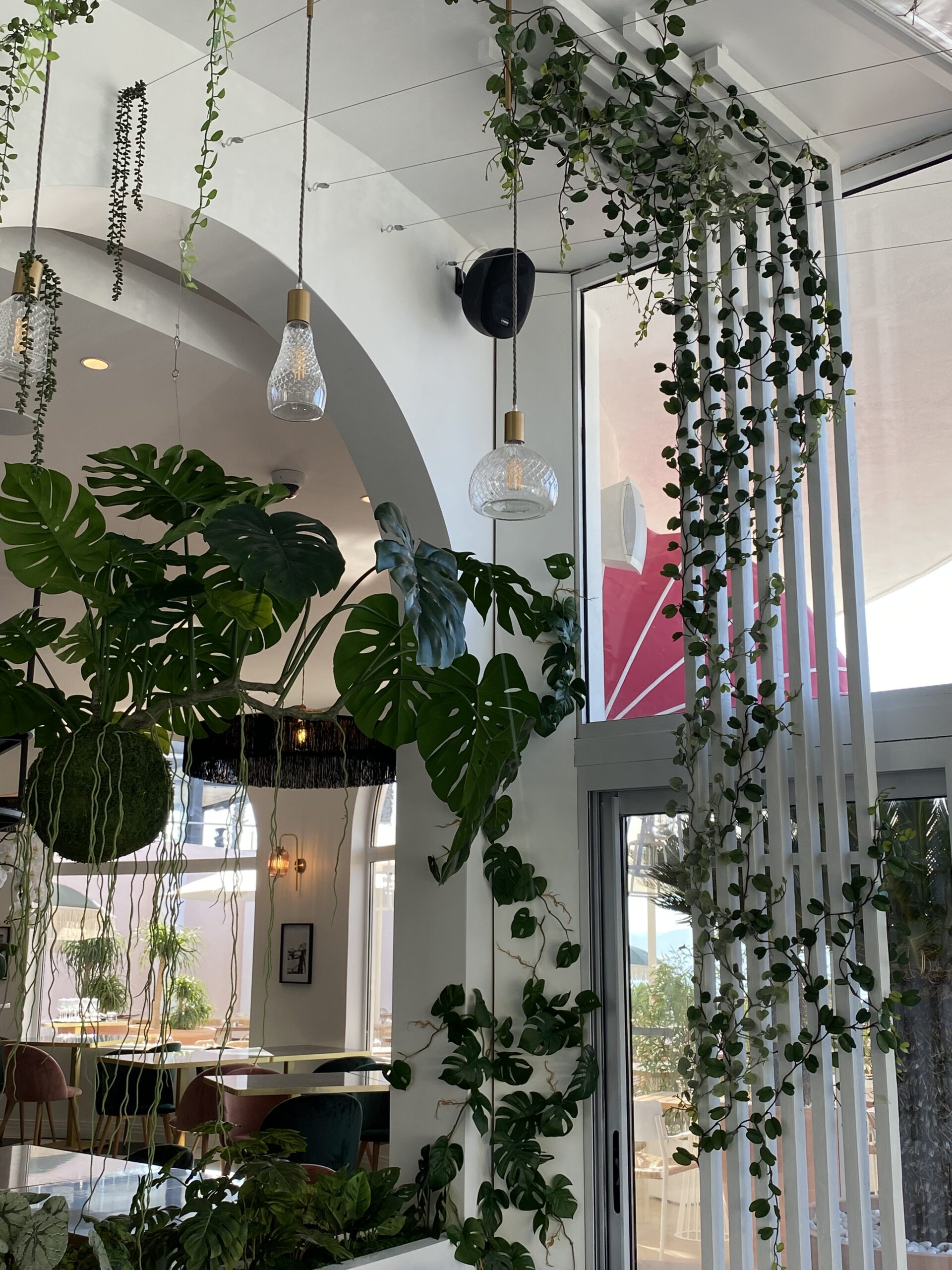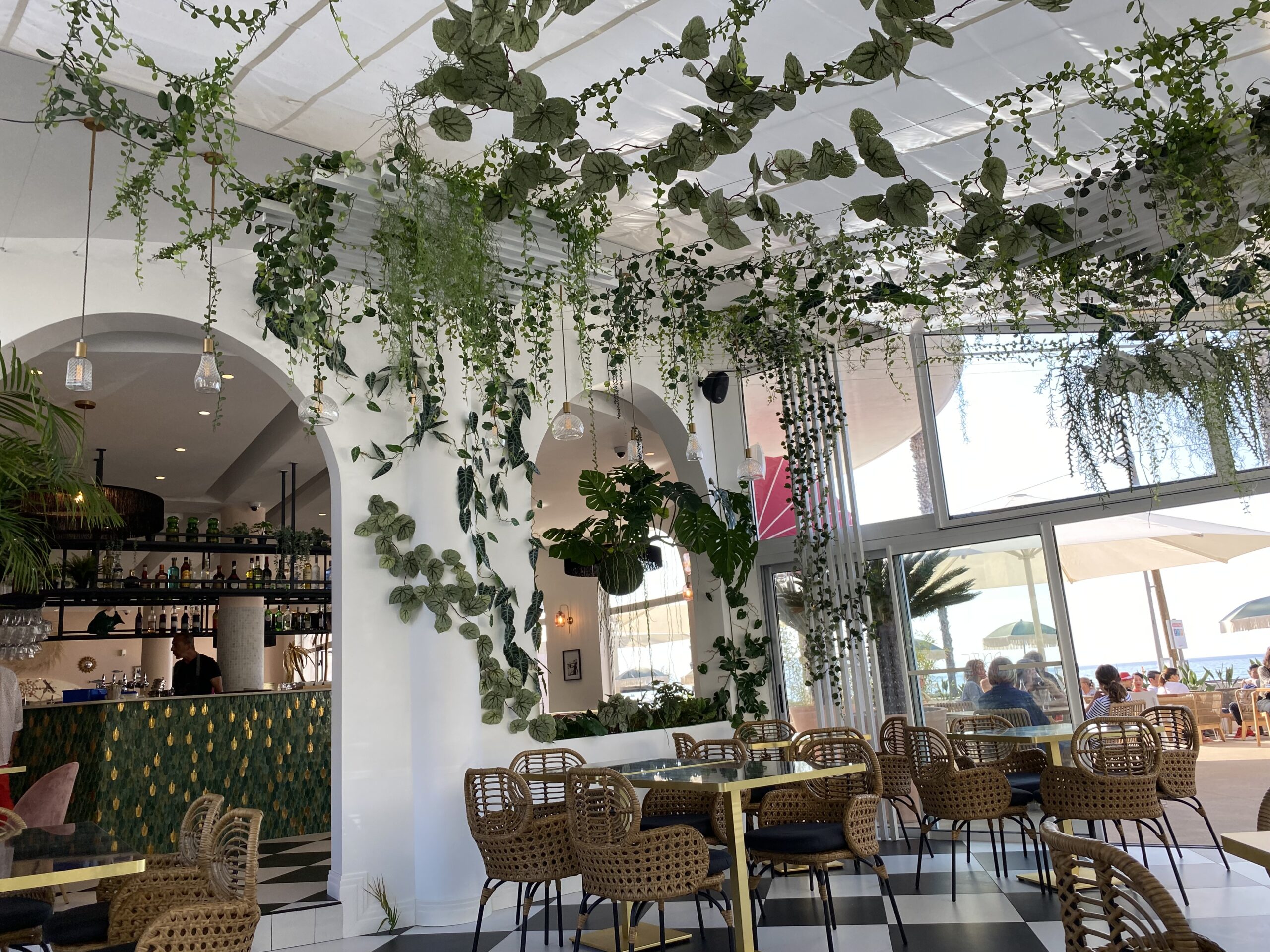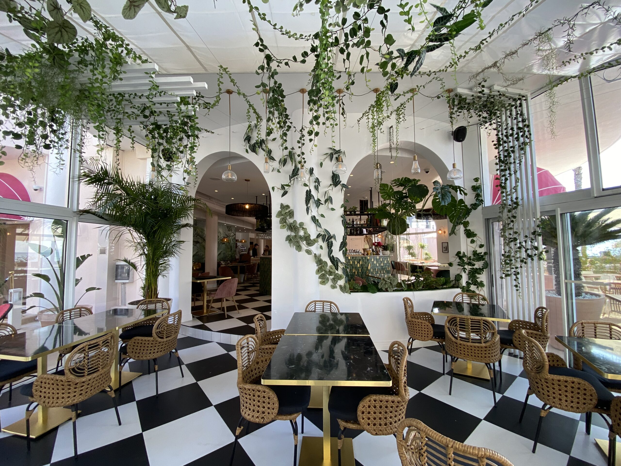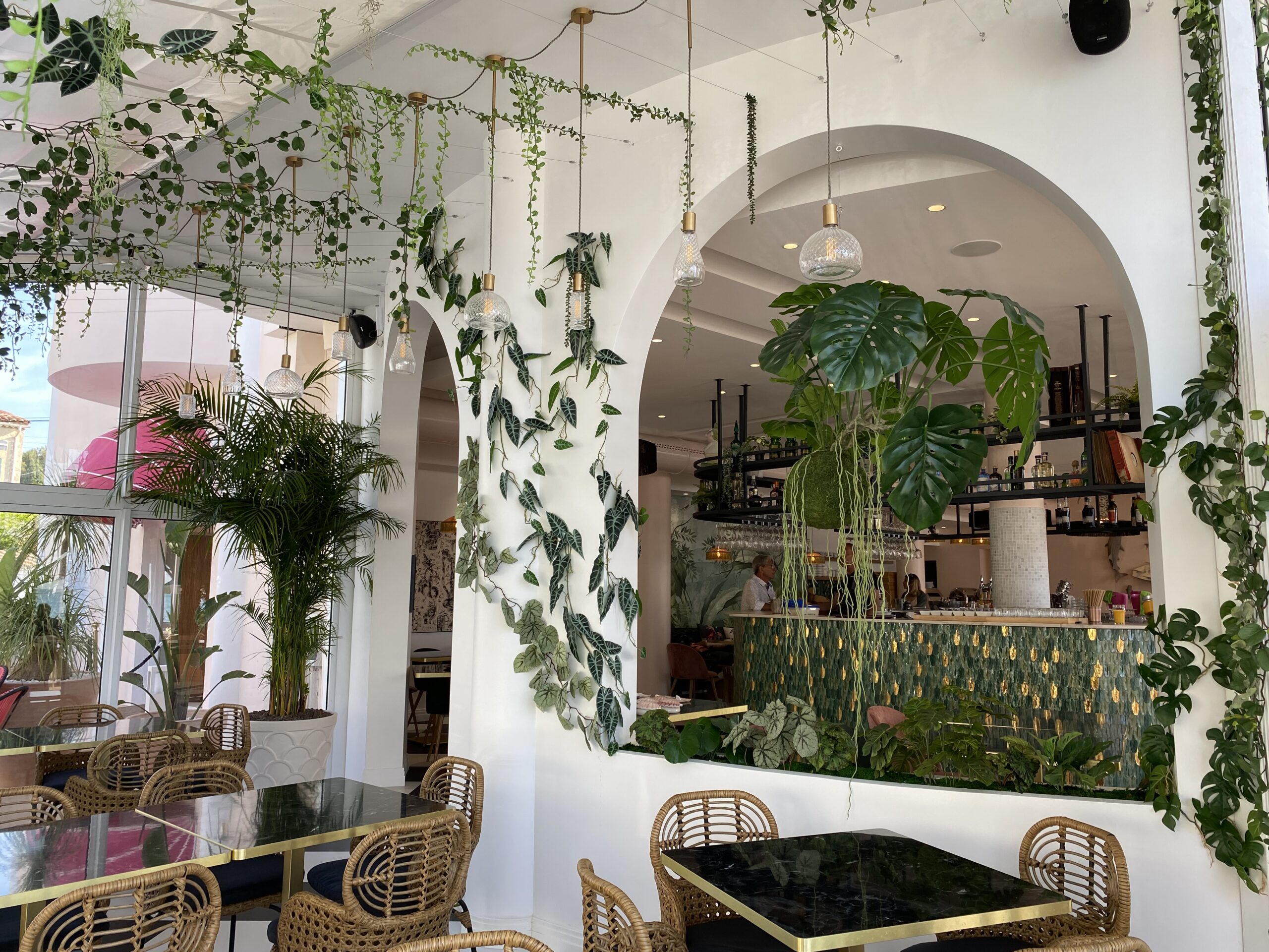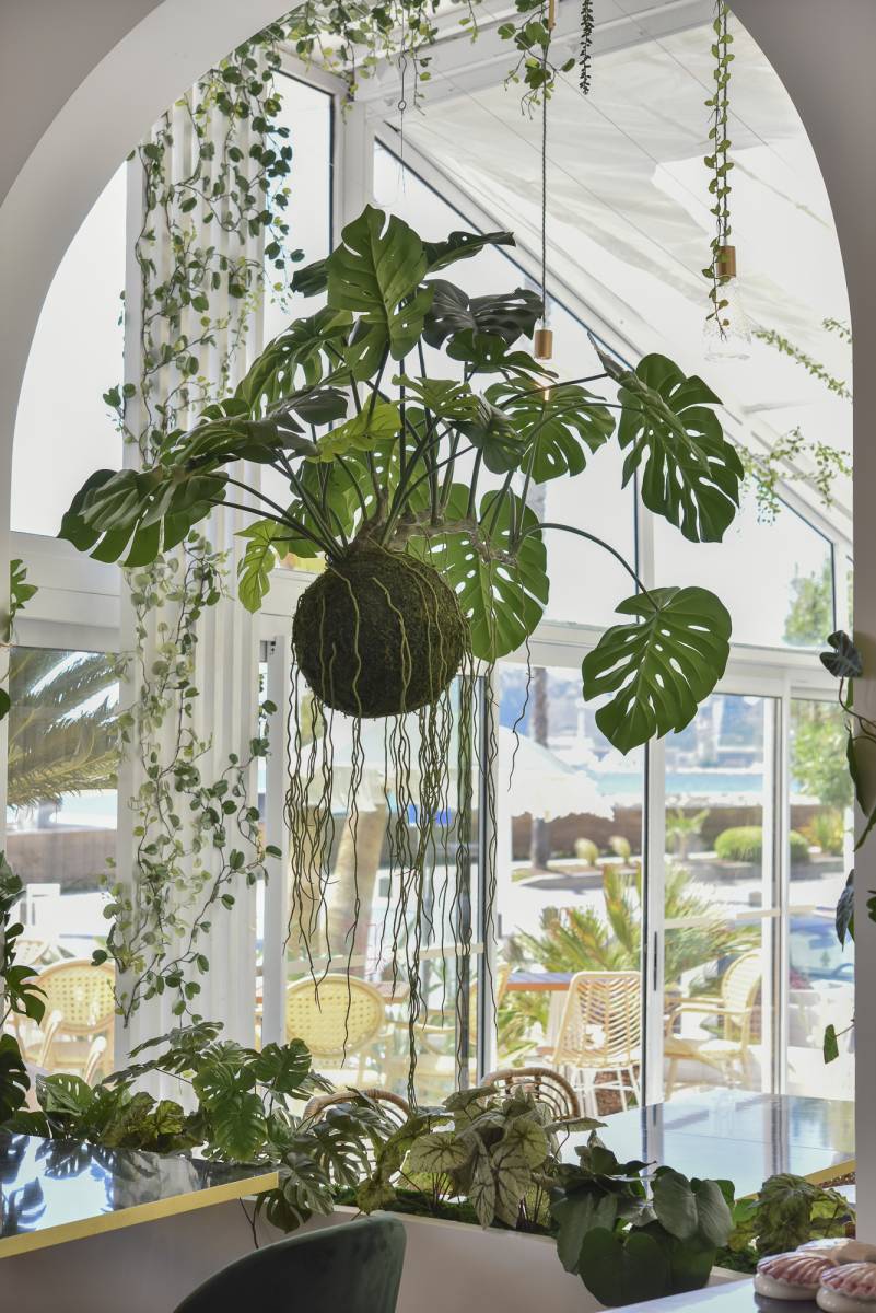 Jungle Art a transformé la véranda en un écrin végétal enchanteur, où les plantes grimpent avec légèreté sur les murs et se déploient au plafond, évoquant le style élégant des années 30 tout en fraîcheur et élégance. Cette décoration raffinée crée une atmosphère apaisante et immersive, faisant du Rose Thé un véritable havre de paix, idéal pour déguster des plats tout en profitant de la vue imprenable sur la mer.