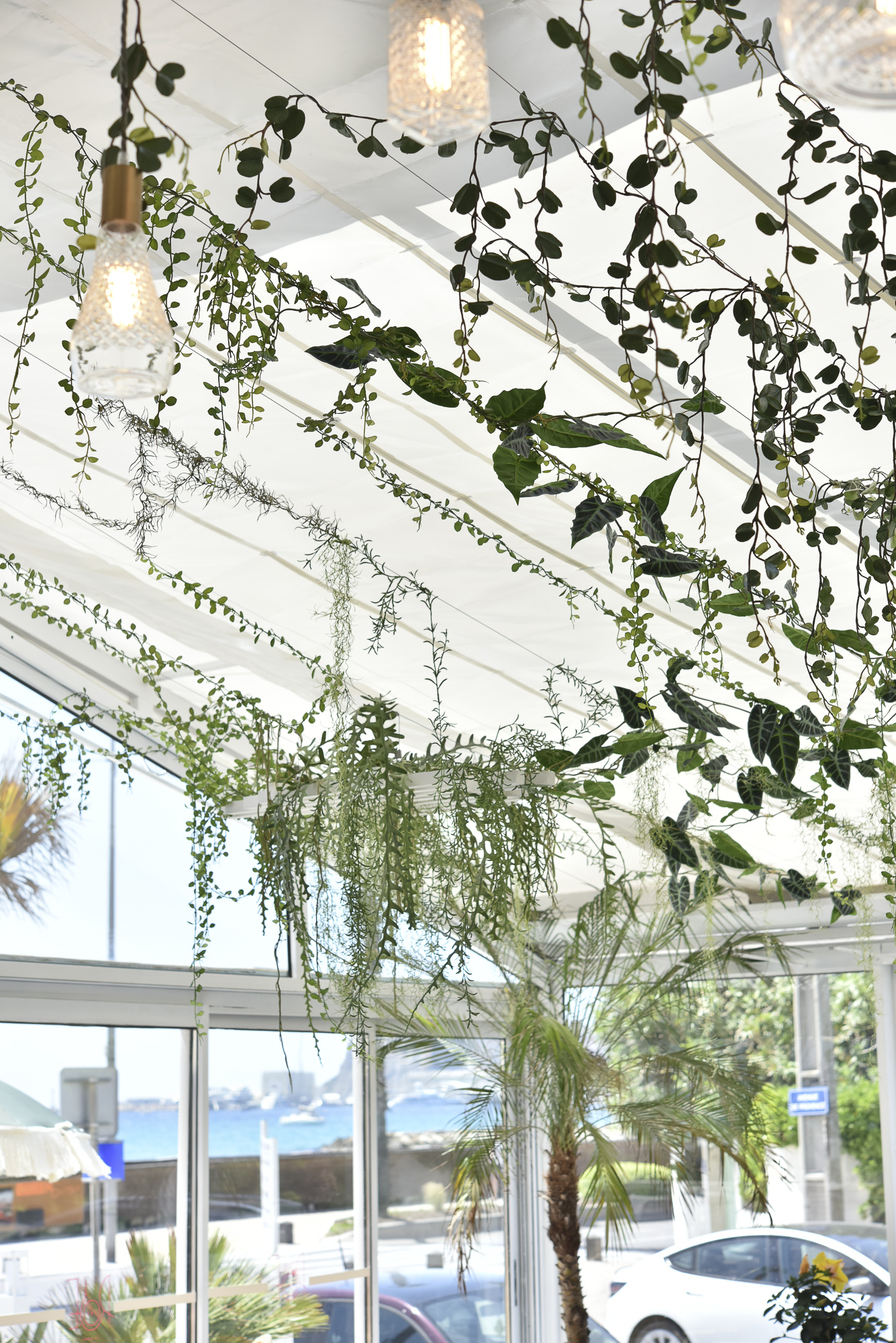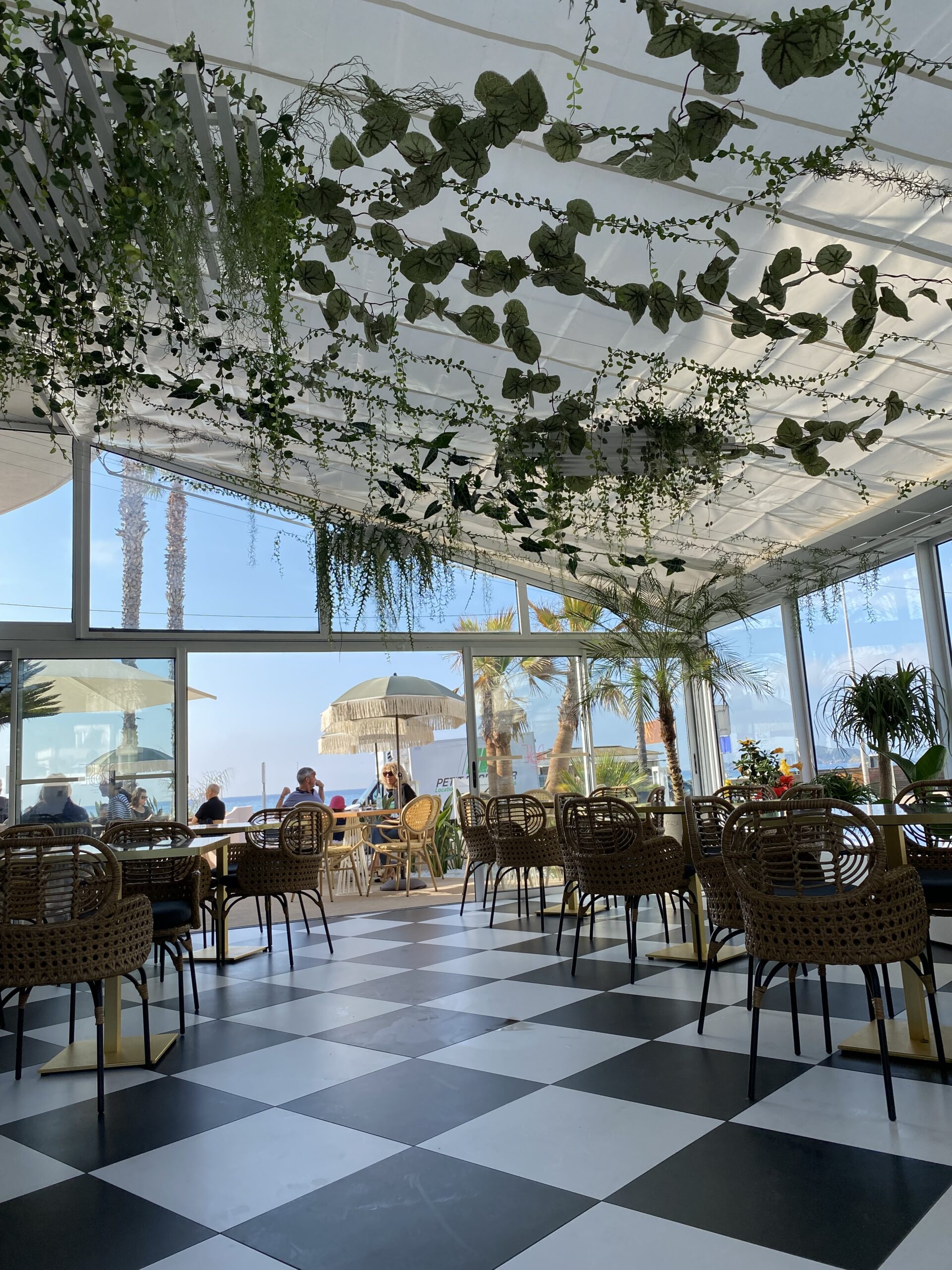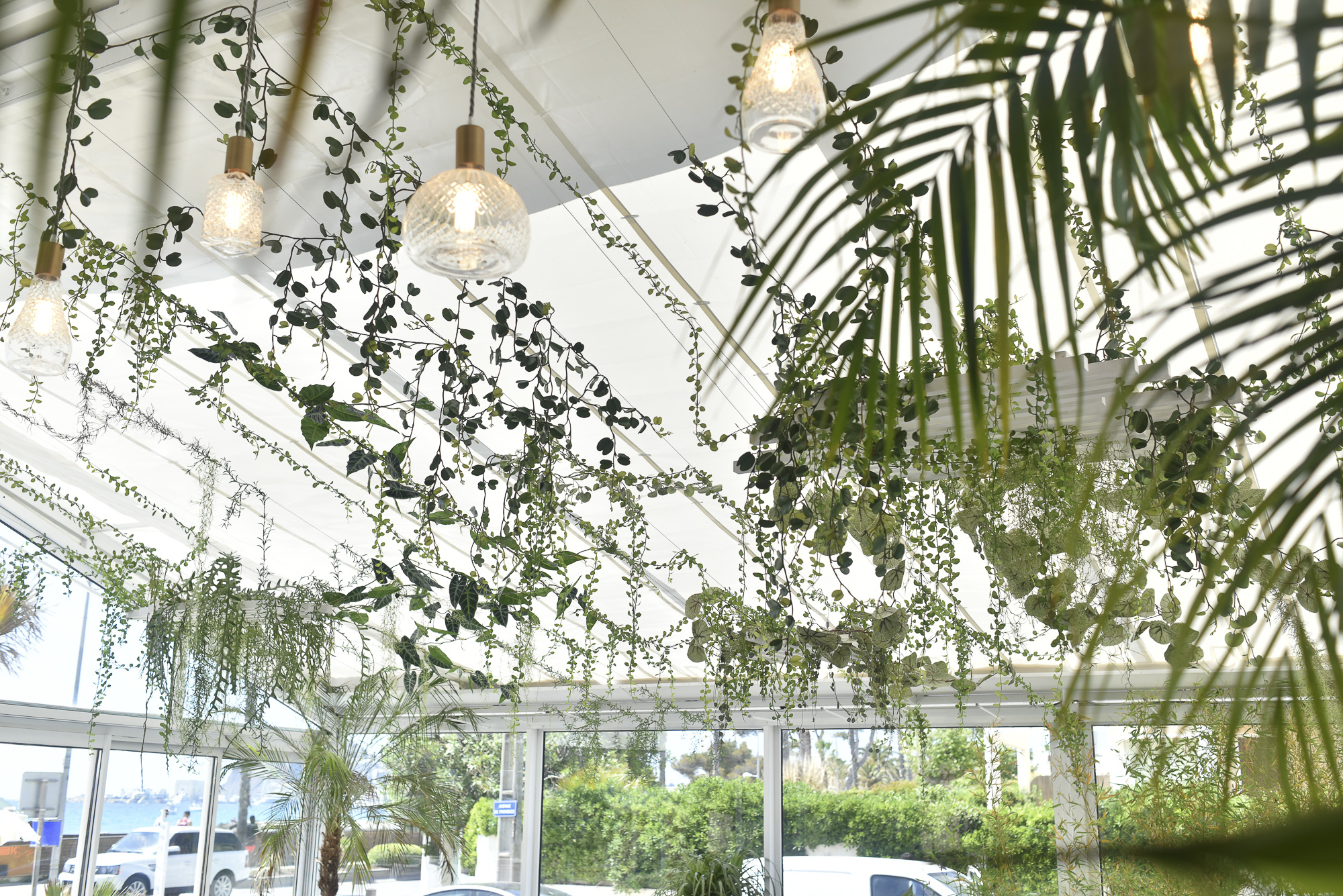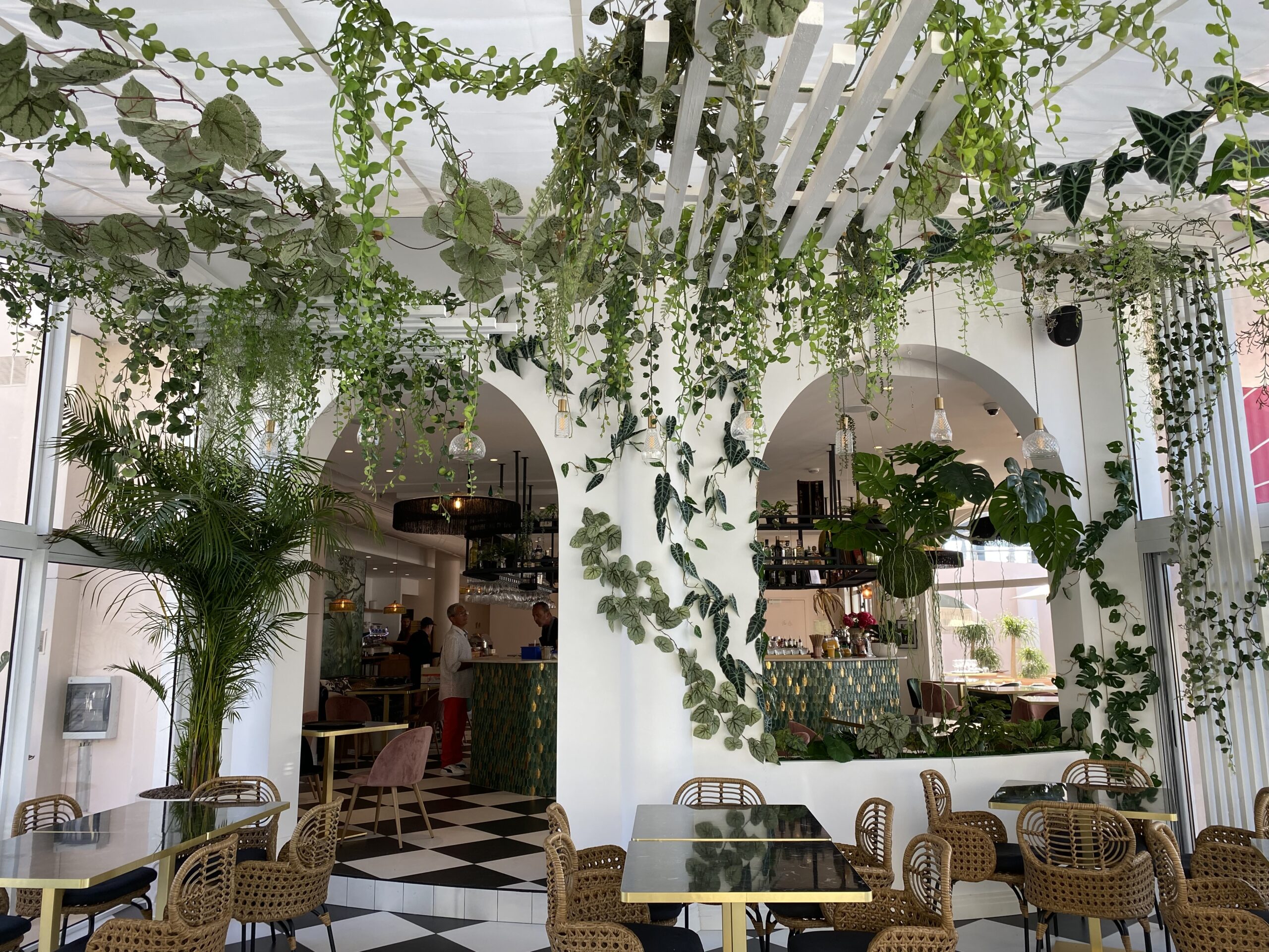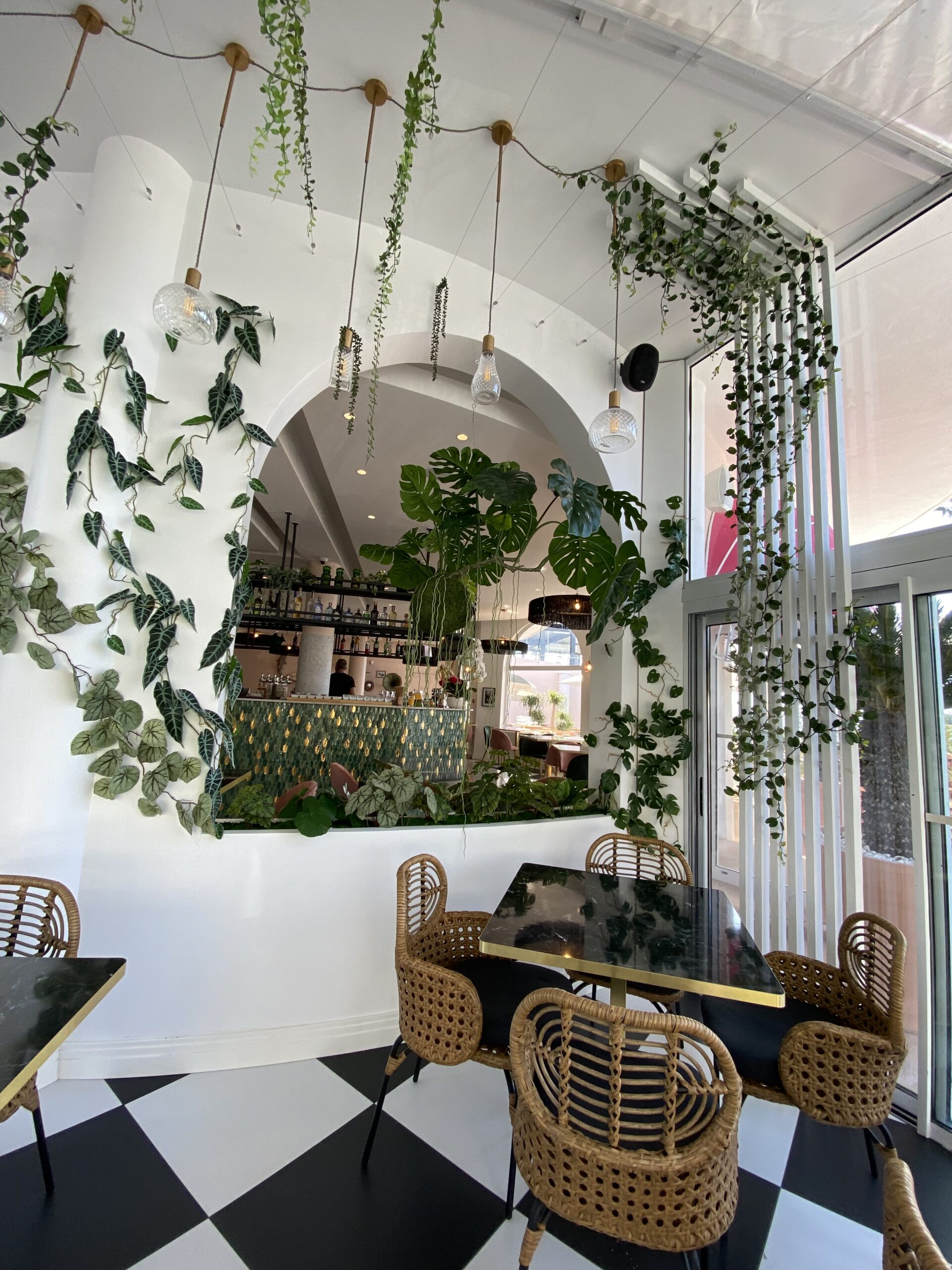 Jungle Art a transformé la véranda en un écrin végétal enchanteur, où les plantes grimpent avec légèreté sur les murs et se déploient au plafond, évoquant le style élégant des années 30 tout en fraîcheur et élégance. Cette décoration raffinée crée une atmosphère apaisante et immersive, faisant du Rose Thé un véritable havre de paix, idéal pour déguster des plats tout en profitant de la vue imprenable sur la mer.