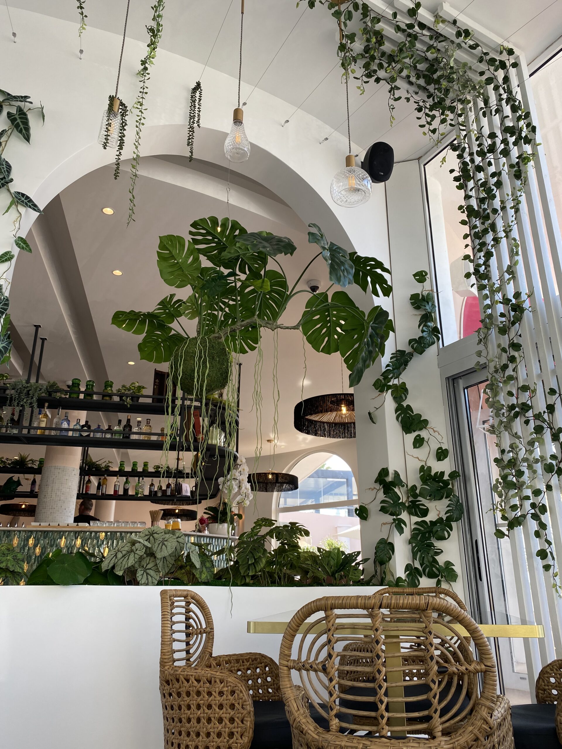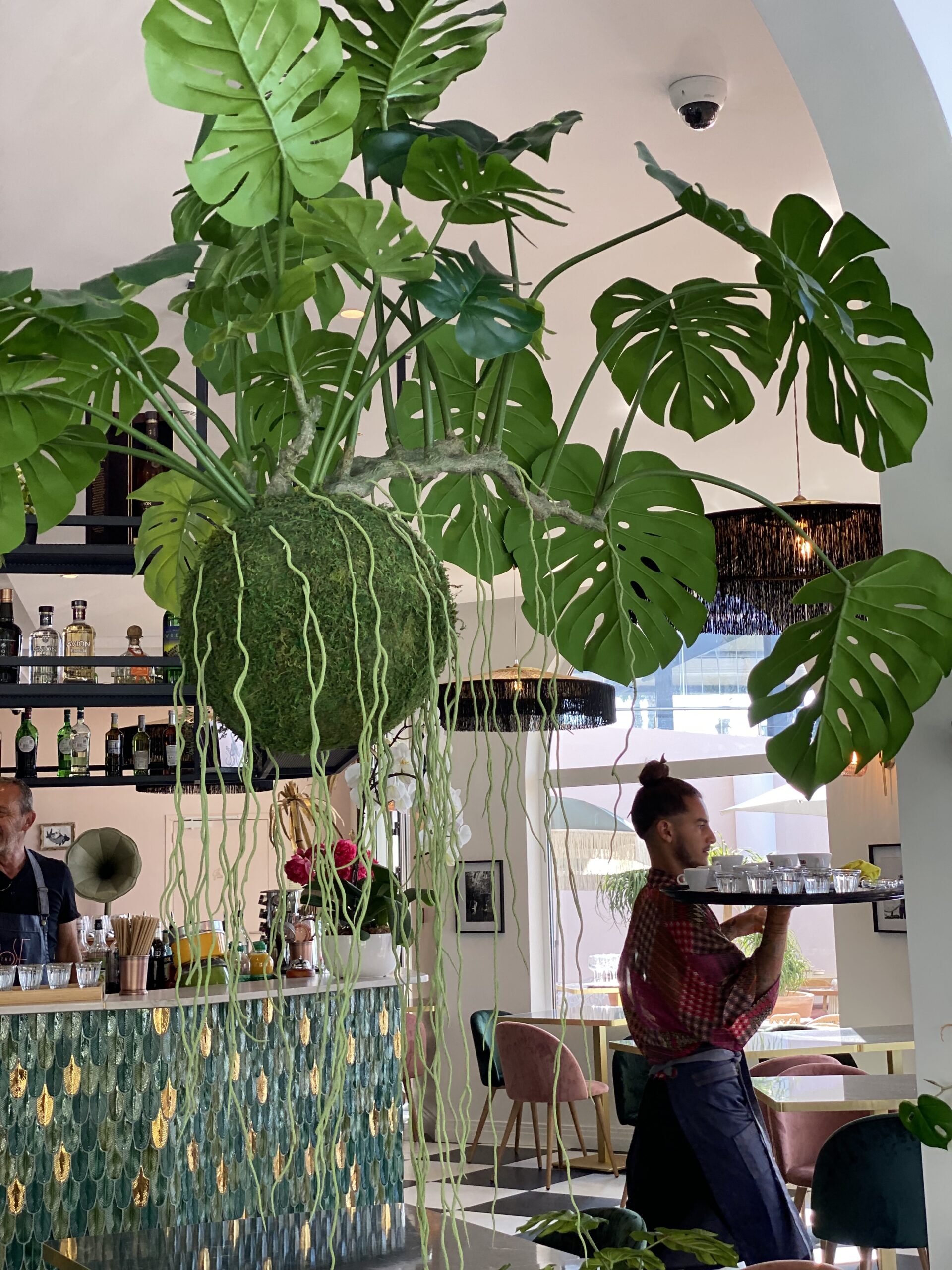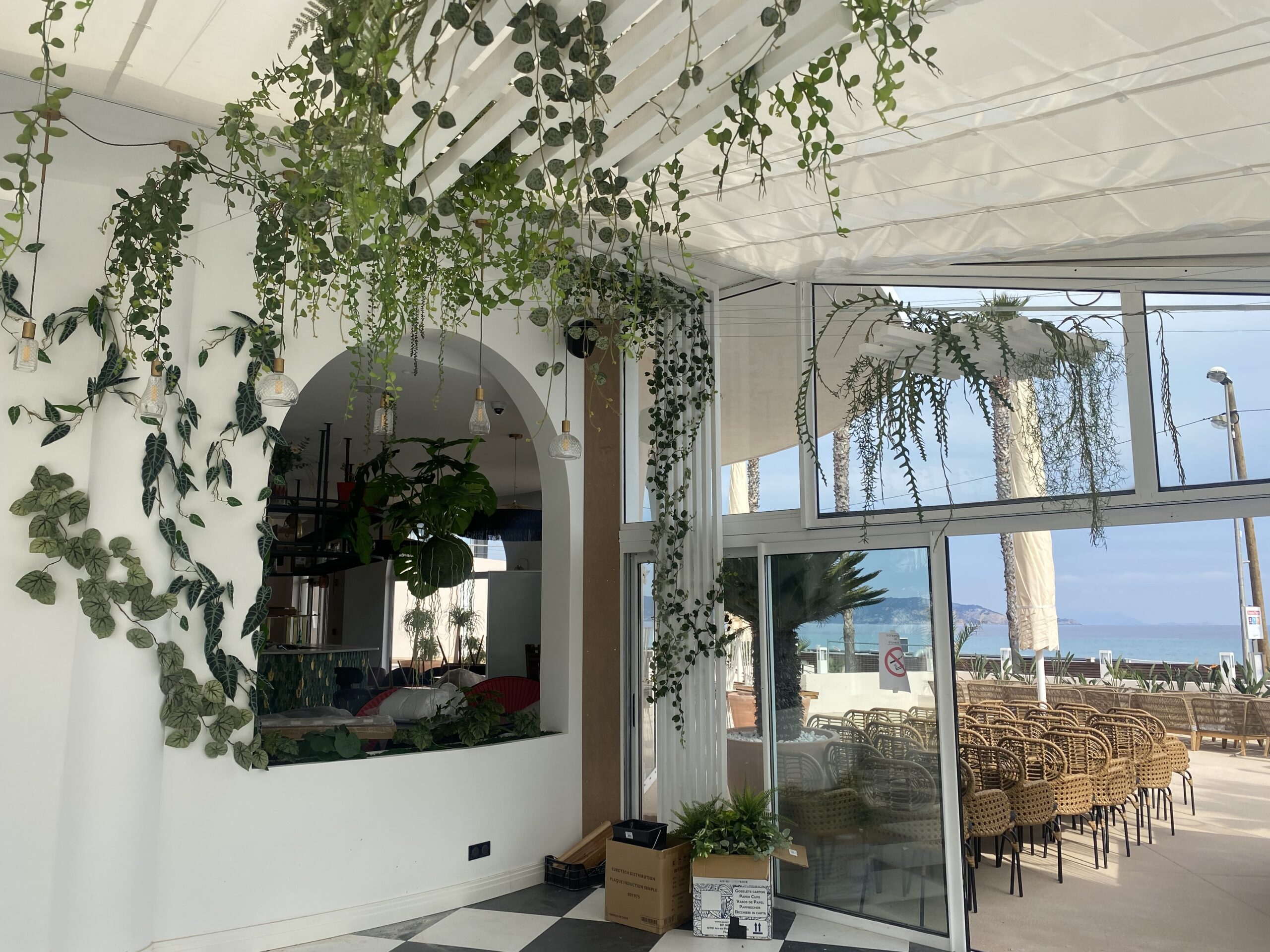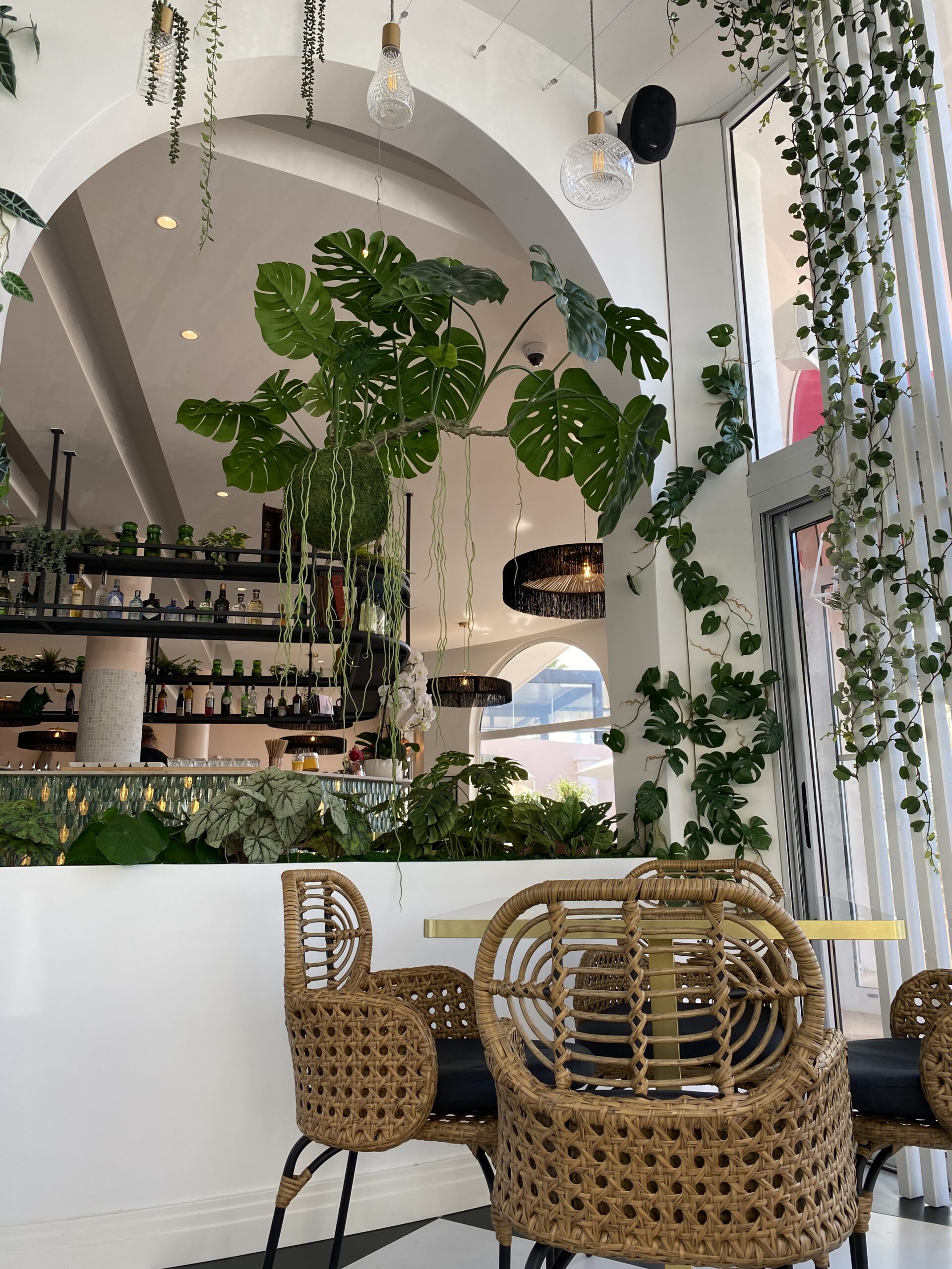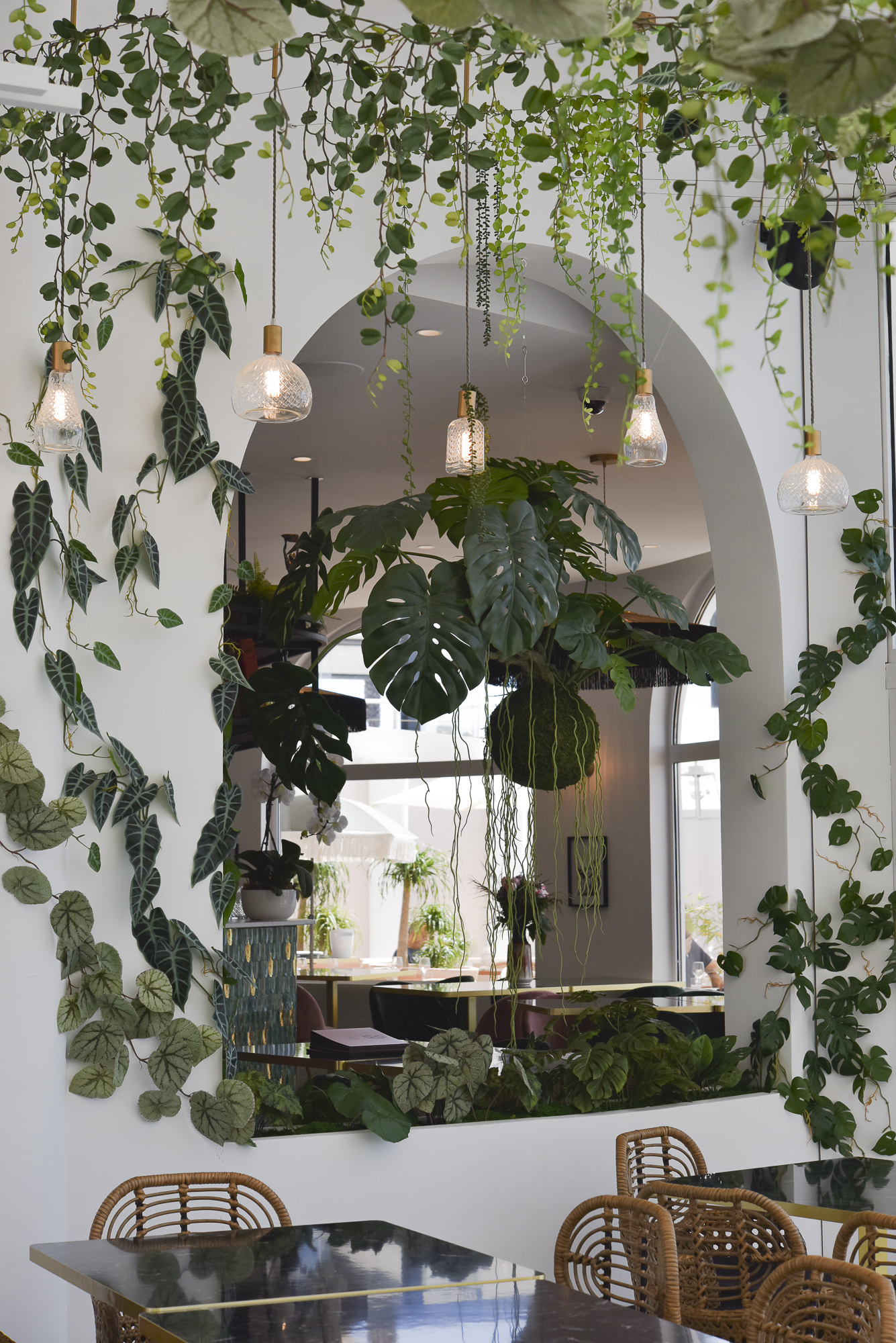 Jungle Art a transformé la véranda en un écrin végétal enchanteur, où les plantes grimpent avec légèreté sur les murs et se déploient au plafond, évoquant le style élégant des années 30 tout en fraîcheur et élégance. Cette décoration raffinée crée une atmosphère apaisante et immersive, faisant du Rose Thé un véritable havre de paix, idéal pour déguster des plats tout en profitant de la vue imprenable sur la mer.