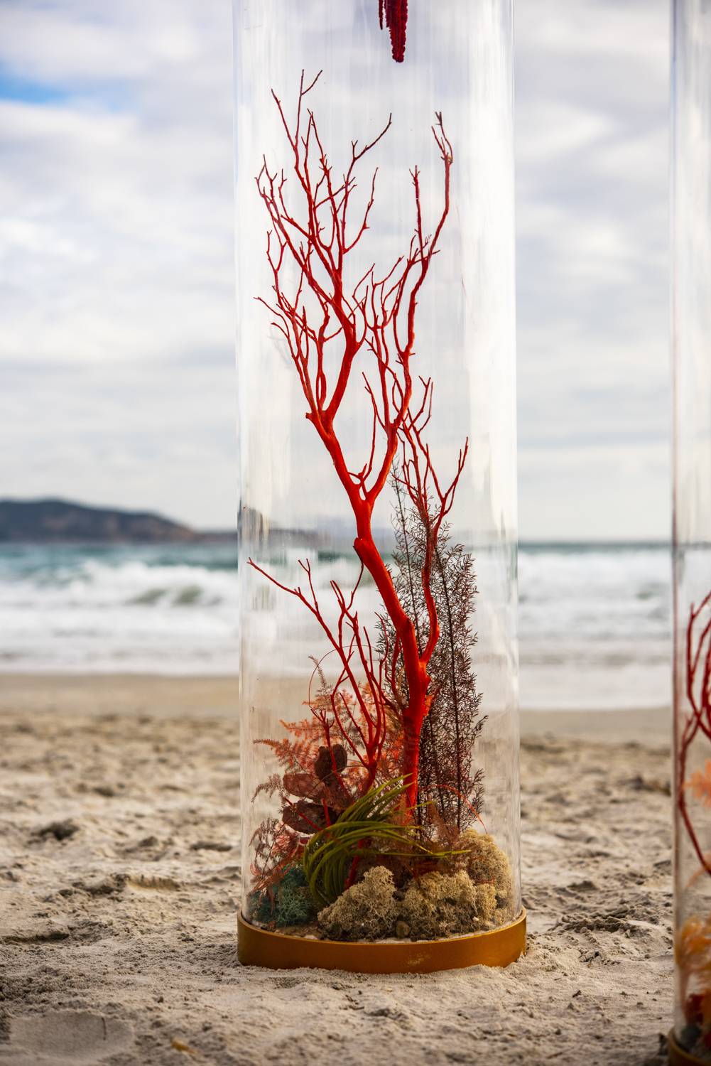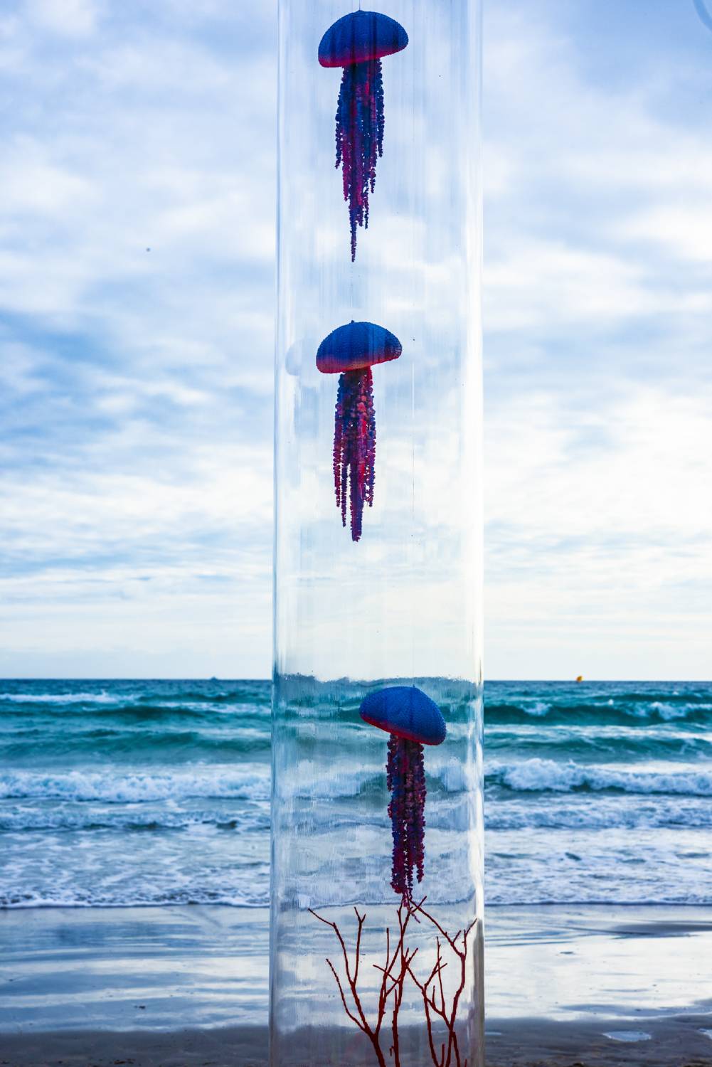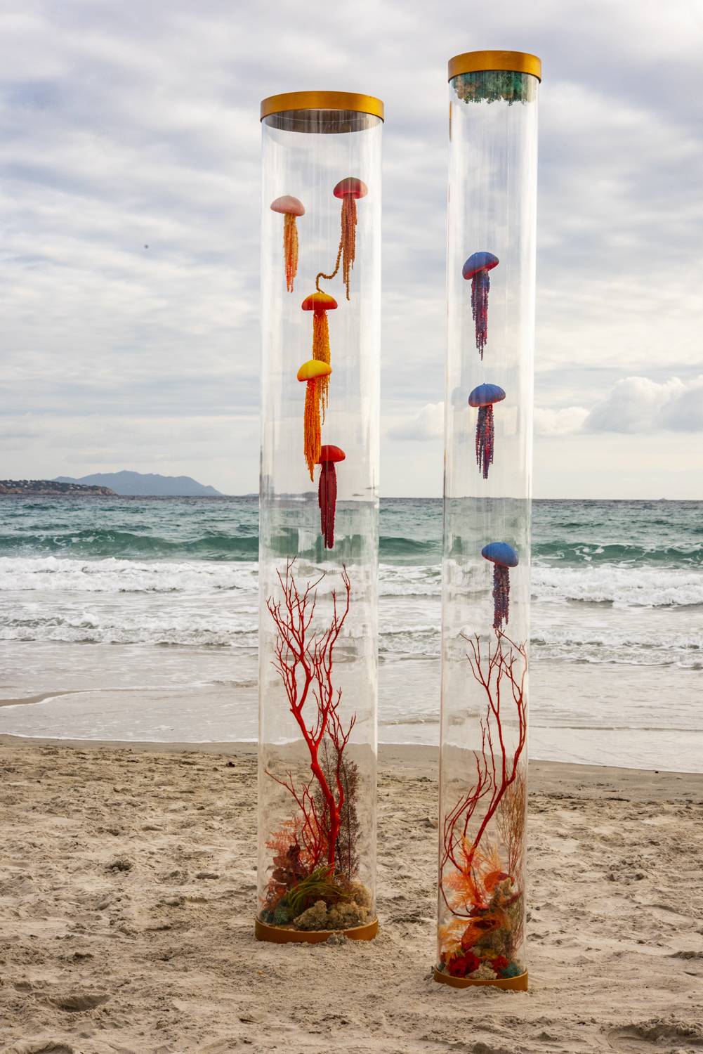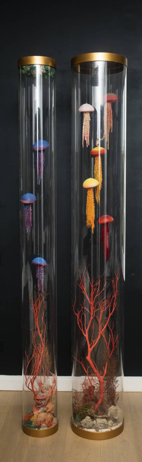 Cette sculpture végétale m’a été inspirée lors d’un voyage à Singapour durant la visite du plus grand aquarium du monde où les méduses, êtres d’élégance et de grâce, nageaient dans des lumières fluorescentes. Ce spectacle unique s’est gravé en moi comme le paradoxe entre leur beauté d’un être qui semble pur et le danger qu’il représente. Les deux faces que nous avons tous, mi-ange mi-démon à nos heures…