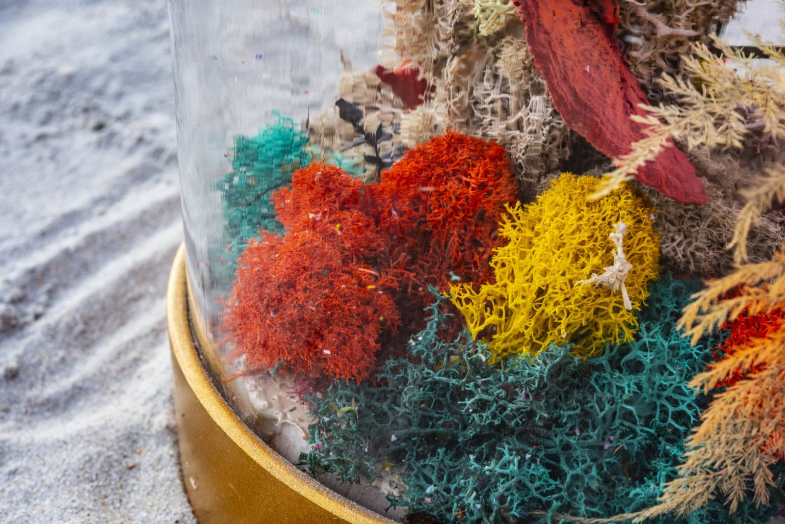 Pour ses créations originales réalisées à la main, j’ai utilisé des porcelaines façonnées sur la coque d’un oursin et des fleurs stabilisées.